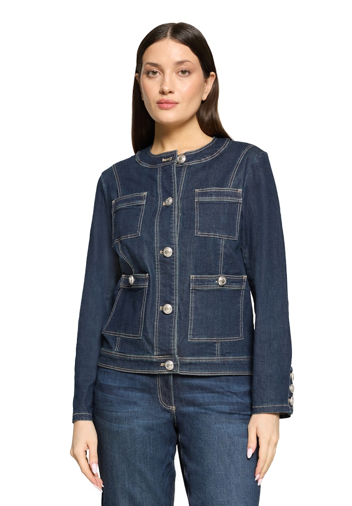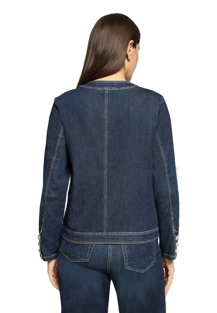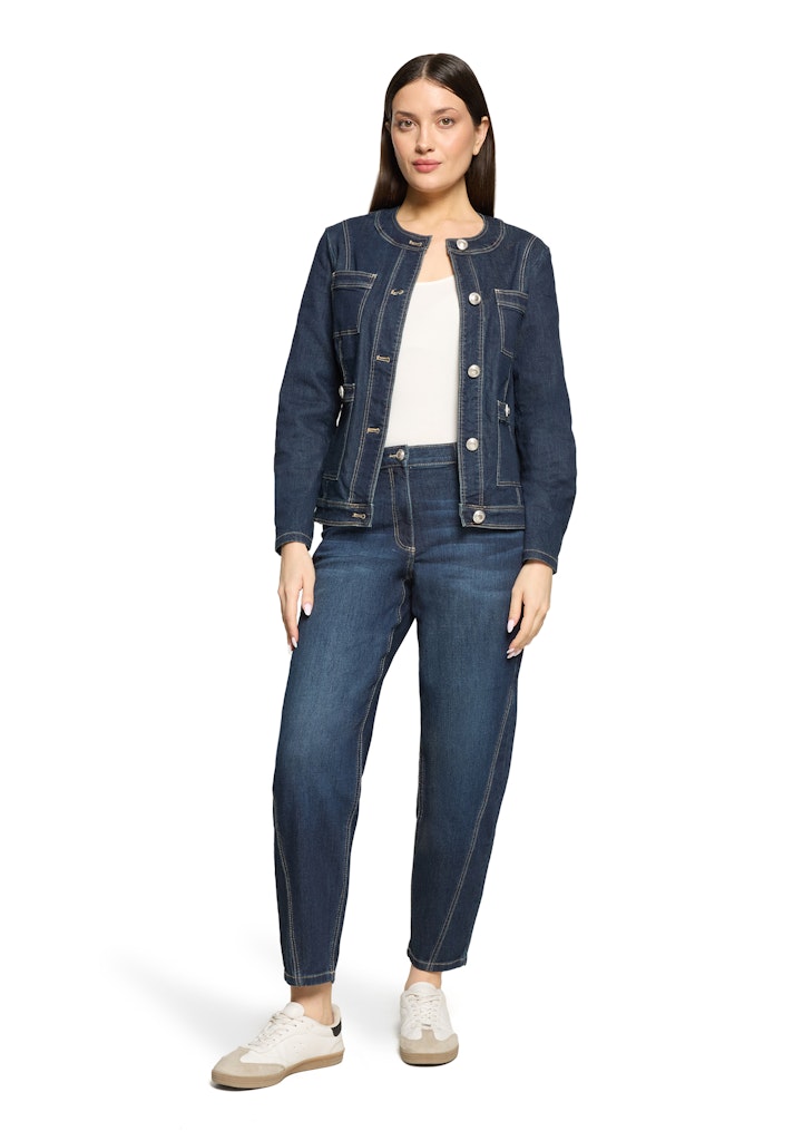 Deze prachtige dames blazer van het merk Betty Barclay is een must-have voor elke vrouwelijke garderobe. De blazer is perfect voor het zomerseizoen en heeft een tijdloze uitstraling dankzij de donkerblauwe denim kleur. Het materiaal bestaat uit 70% katoen, 23% polyester, 4% Lyocell en 3% Elastaan, wat zorgt voor een comfortabele pasvorm en een lichte stretch. De blazer kan eenvoudig gestreken worden op een lage temperatuur en blijft zo altijd netjes en verzorgd. Met deze blazer ben je helemaal klaar voor het jaar 2026 en kun je eindeloos combineren met verschillende outfits. Bestel deze blazer nu en voeg een vleugje stijl toe aan je kledingkast!